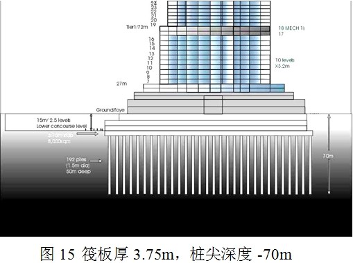 采用摩擦樁加筏板聯(lián)合基礎(圖14)。194根現(xiàn)場灌注樁,長度約43m,直徑1500mm。樁尖深度-70m(圖15)。筏板厚度3.75m。對筏板連同樁、周邊土體進行了三維有限元分析,分析表明,基礎長期沉降為80mm,施工到135層時沉降30mm,工程完工后,實測沉降為60mm。